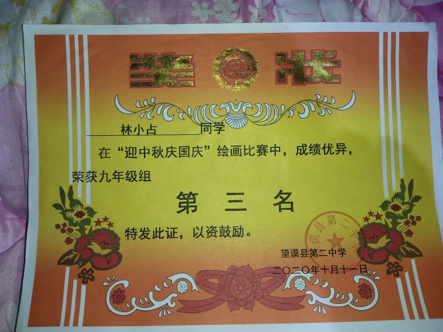2020年“迎中秋国庆“绘画比赛第三名