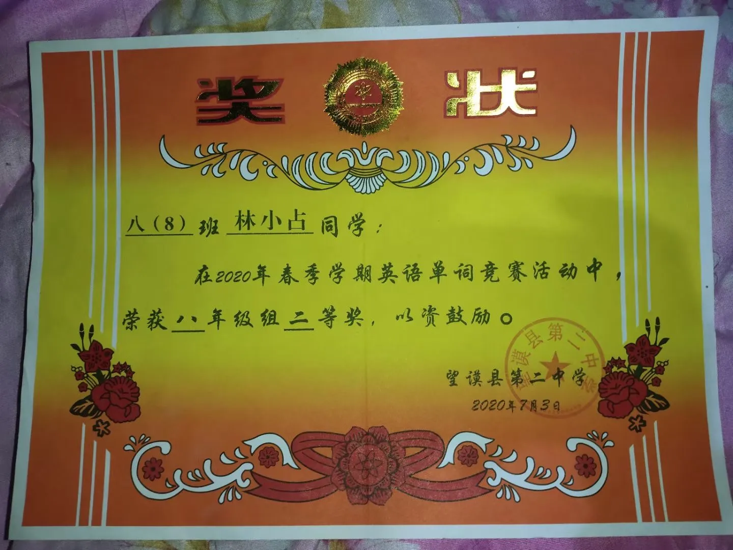 2020年春季学期英语单词竞赛活动二等奖