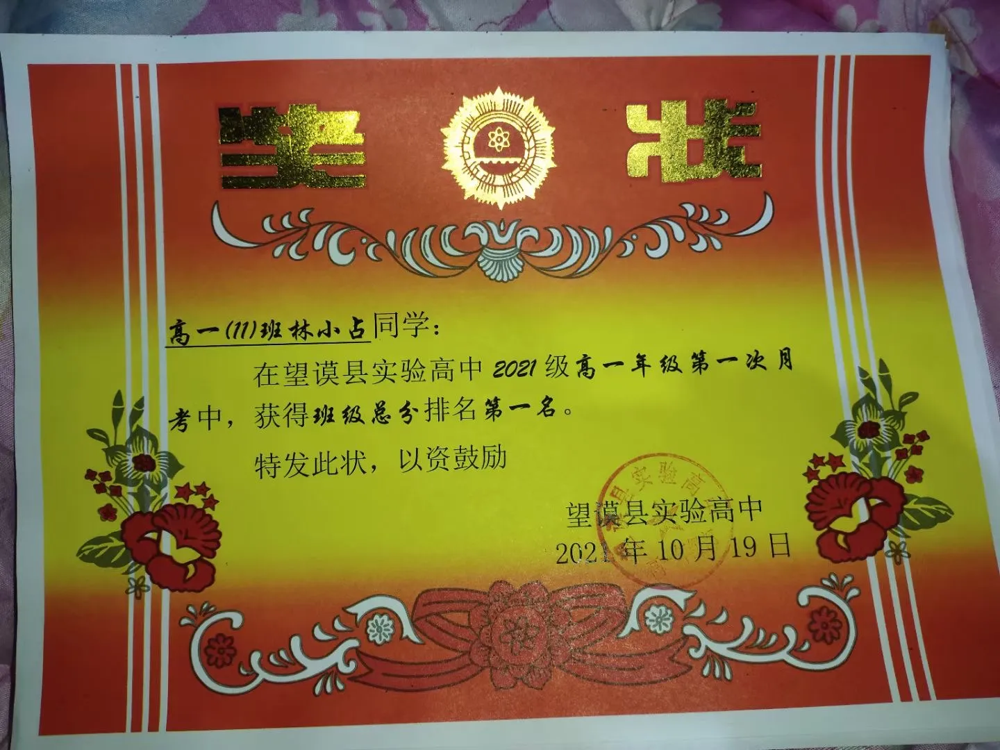 2021年高一年级第一次月考班级总分第一名
