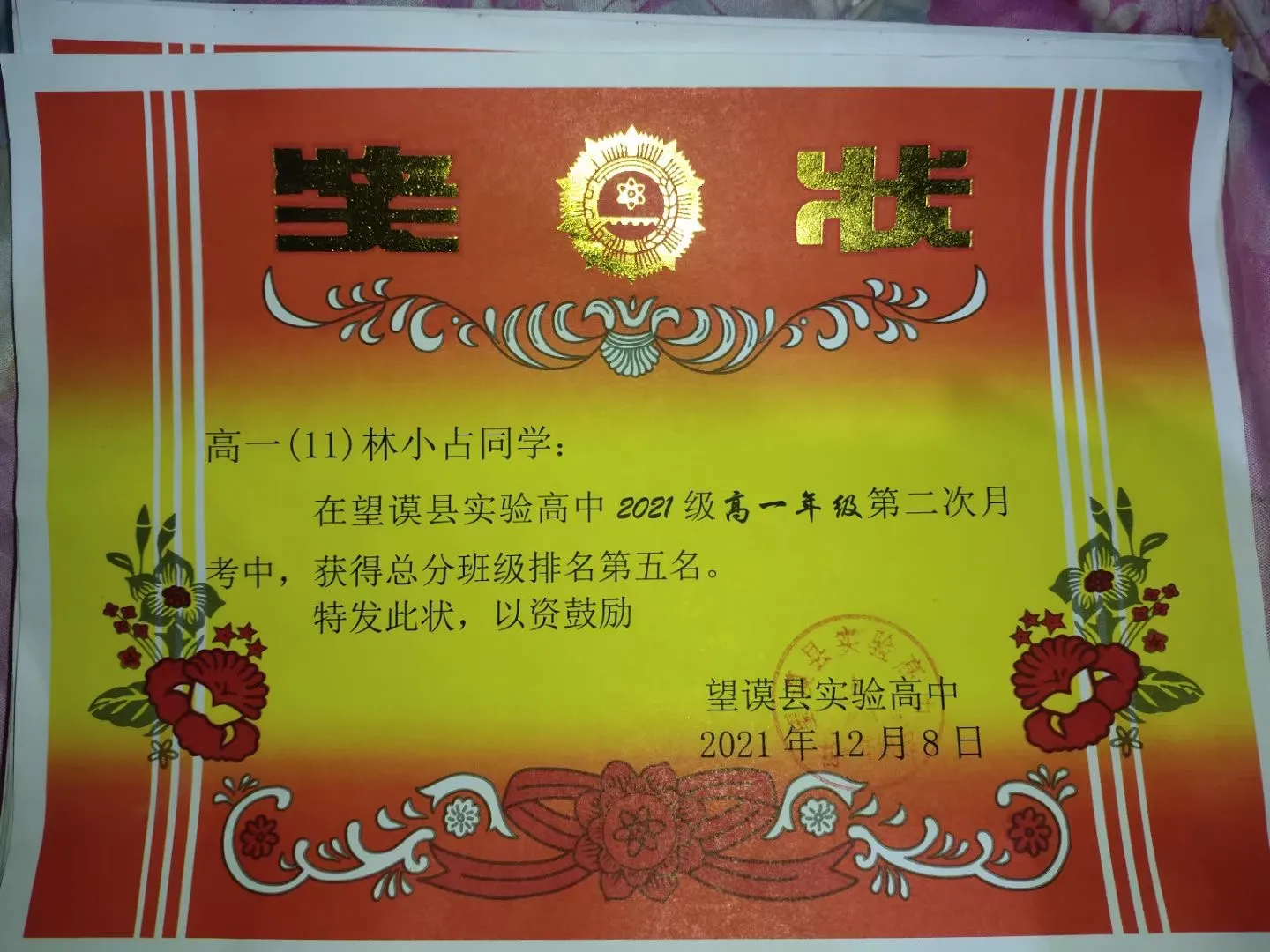 2021年高一第二次月考总分班级排名第五名