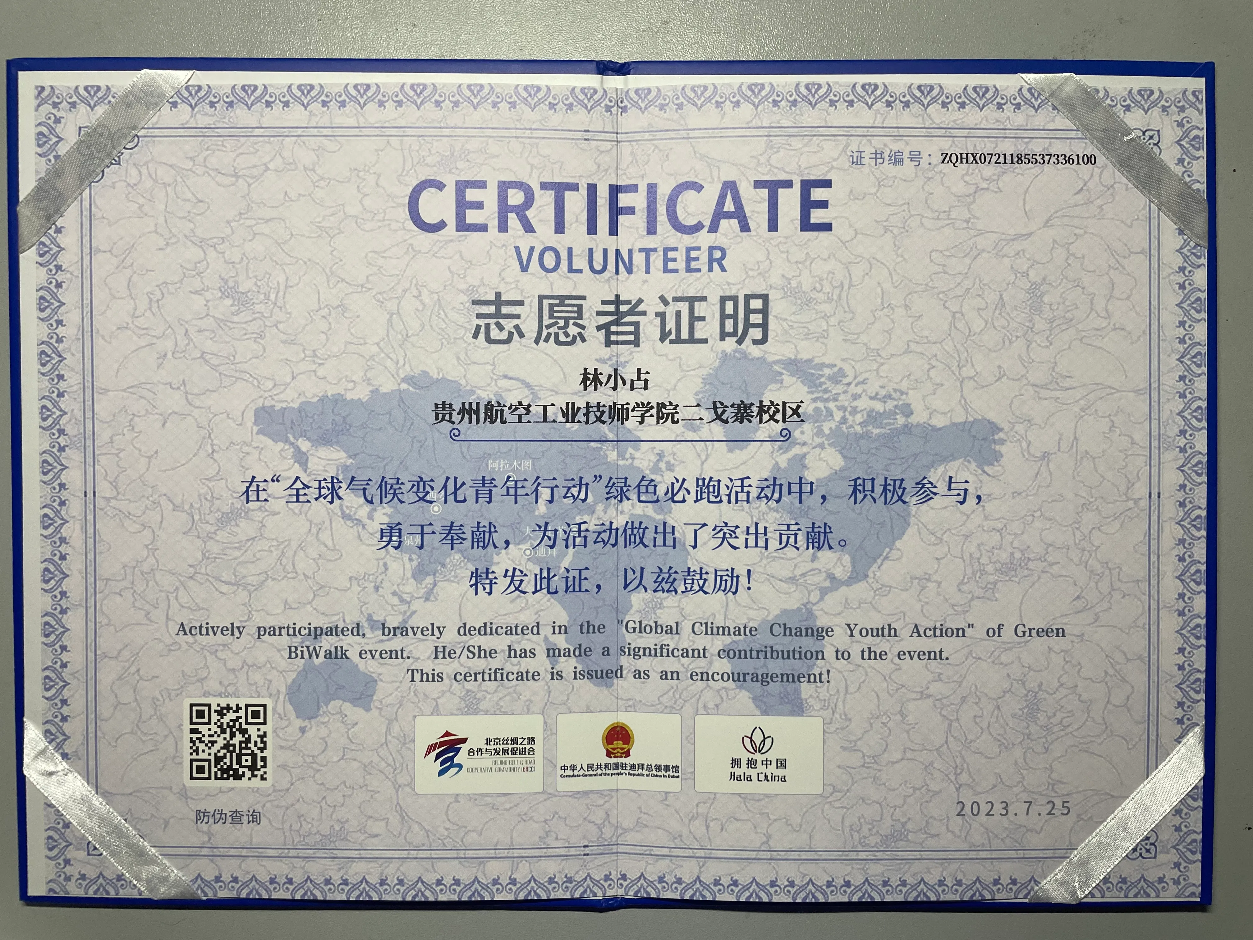 2023年“全球气候变化青年行动”绿色必跑活动志愿者证明