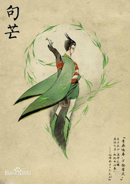句(gōu)芒,男,中国古代民间神话中的木神(春神),主管树木的发芽生长,少昊的后代,名重,辅佐伏羲氏。太阳每天早上从扶桑上升起,神树扶桑归句芒管,太阳升起的那片地方也归句芒管。 芒神,又名句芒、木神、春神,是主宰草木和各种生命生长之神,也是主宰农业生产之神。 11.凤
